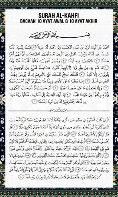 Situs mudah dibaca, cepat dibuka & hemat kuota. Assalamualaikum salam jumaat penghulu segala hari. Zaman dajjal adalah zaman fitnah yang besar, bukan sedikit orang yang beriman pada pagi dan kemudian pada petang hari menjadi kafir. Ketika pelajaran abah yasin (salah satu guru sesepuh) di pondok. Baca surat al kahfi lengkap bacaan arab, latin & terjemah indonesia.